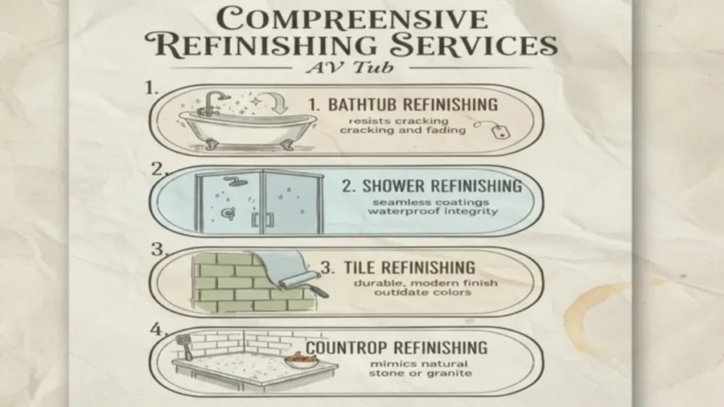 An AV Tub is a professional refinishing firm based in Los Angeles that specializes in restoring and resurfacing bathtubs, showers, tiles, and countertops. Instead of replacing old or damaged fixtures, it applies a durable new finish to existing surfaces made of porcelain, fiberglass, or acrylic, giving them a fresh, glossy look.